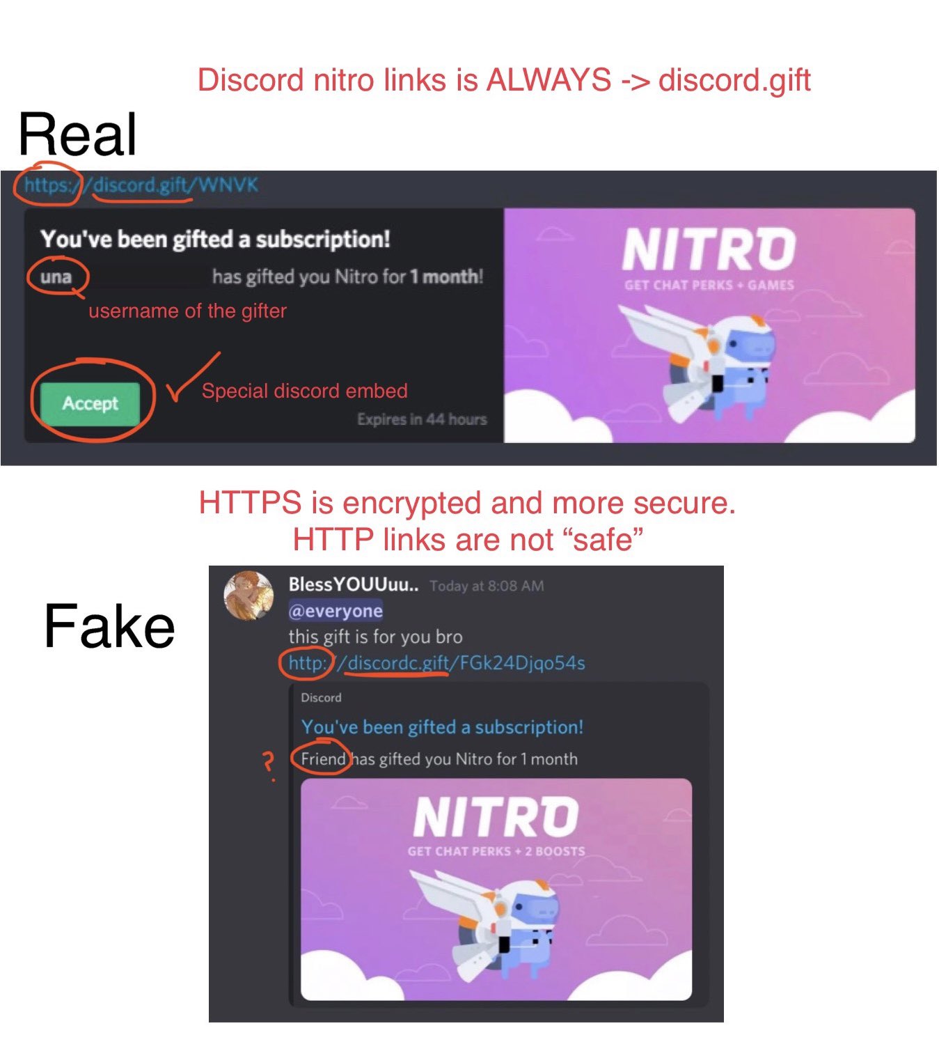 Hana On Twitter Here Are Some Signs To Tell Real Nitro Vs Fake Nitro Don T Click Any Links For It To Accept A Real Discord Nitro Gift You Don T Need To Click